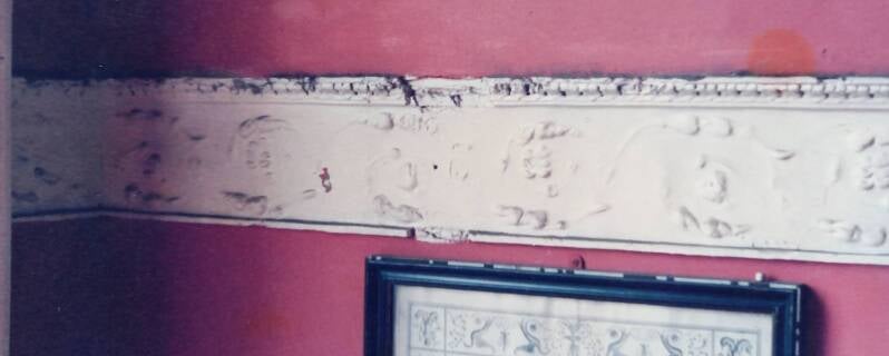 Architrave and overdoor in back drawing room after removal of built up paint layers and repainting, although replaced righthand corner of cornice is awaiting recarving.